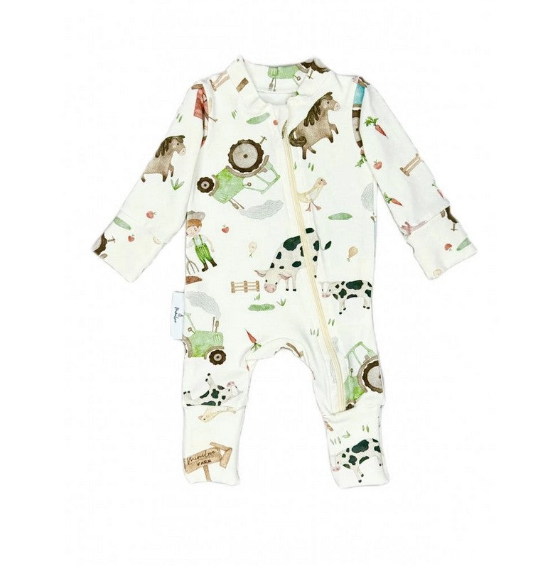 Baby-Overall aus Baumwolle mit langen Ärmeln und Beinen sowie Fußwärmern.