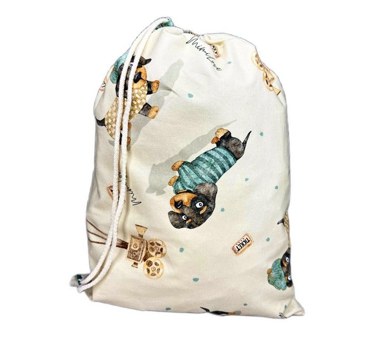 Die Bettwäsche ist in einem Baumwollbeutel im gleichen Muster verpackt.