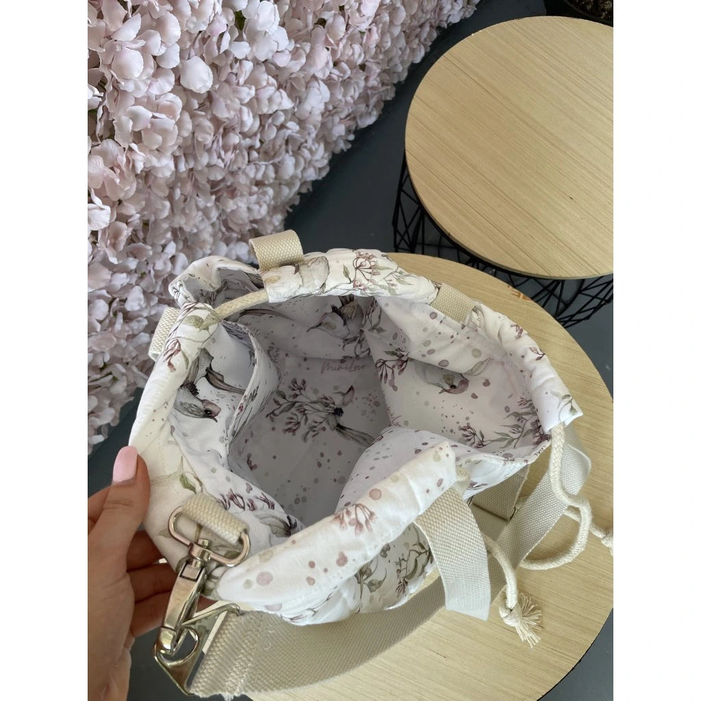 Die Tasche besteht aus Baumwollmaterial und innen befindet sich ein wasserdichtes Material im gleichen Muster, das Wasserfestigkeit und einfache Pflege garantiert. Einfach immer feucht abwischen. Die Tasche hat zwei kürzere feste Griffe und einen verstellbaren langen Riemen, mit dem die Tasche über der Schulter getragen werden kann. Der Verschluss erfolgt durch Ziehen am Riemen.