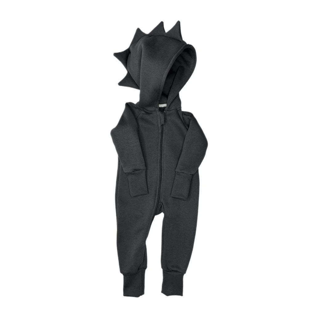 Sehr praktischer Overall mit Dino-Kapuze, aus sehr bequemem und warmem Baumwollmaterial. Das Kind fühlt sich darin wohl.